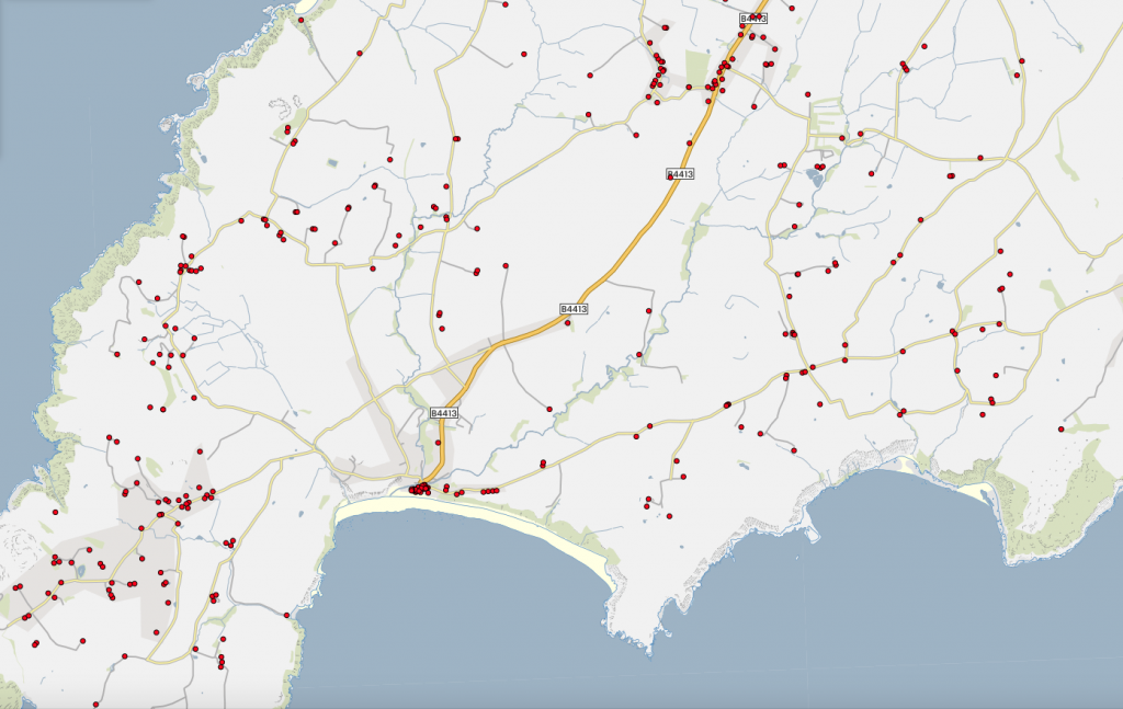 Mae cysylltiad gwael rhwng rhannau o gymunedau: Rhoshirwaun, Llanfaelrhys, Anelog a Uwchmynyd a’r ardaloedd cyfagos. Mae’r map isod yn dangos yr eiddo nad ydyn nhw’n rhan o unrhyw gynllun cyflwyno ar hyn o bryd i gael band eang cyflym iawn wedi’i gysylltu yn y 2 – 3 blynedd nesaf. Yn ôl y data mwyaf diweddar sydd ar gael gan Lywodraeth Cymru, ni fydd yr holl eiddo sydd wedi’u marcio â dot coch yn cael band eang cyflym iawn cyn 2023 ar y cynharaf.