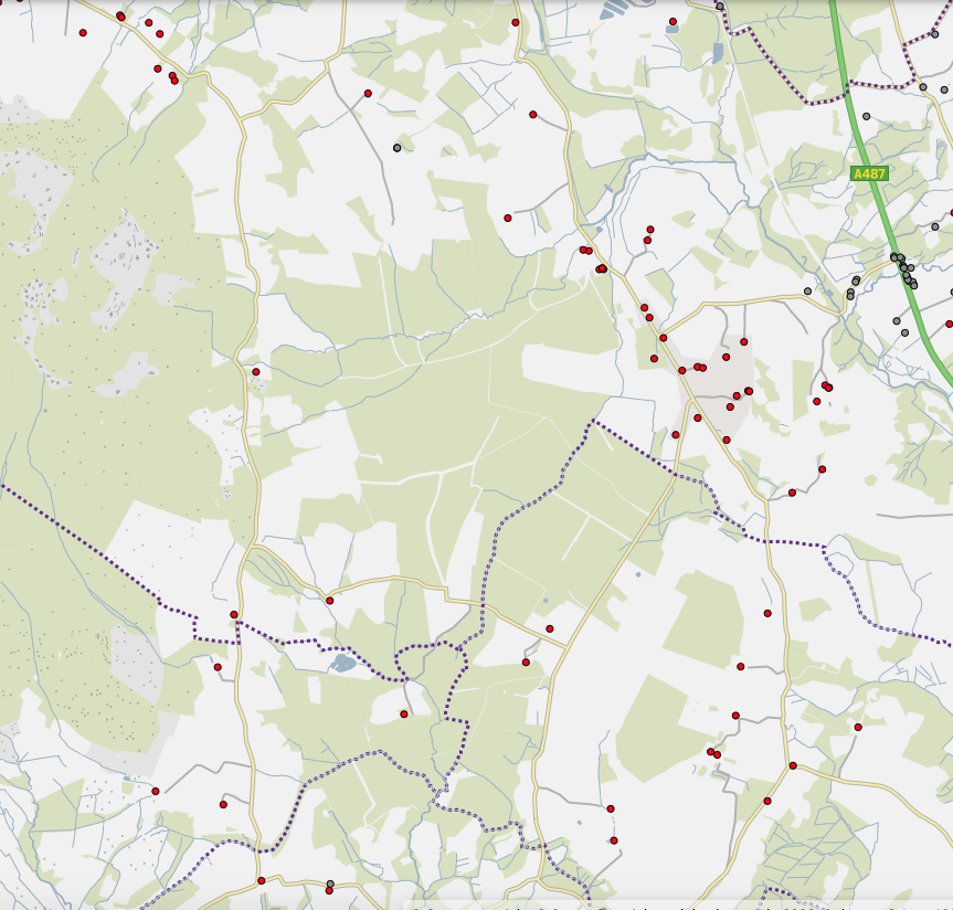 The community of Bwkch Derwin is poorly connected. The map below shows the properties that are currently not part of any rollout plan to get superfast broadband connected in the next 2 – 3 yrs. According to most recently available Welsh Government data all the properties that are marked with a red dot will not get superfast broadband before 2023 at the earliest.