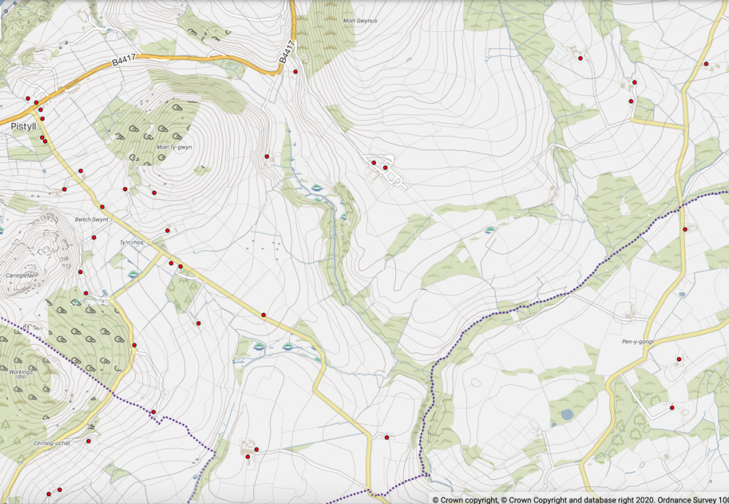 Mae cysylltiad gwael rhwng rhannau o gymunedau (MEWNOSOD ENW) a’r ardaloedd cyfagos. Mae’r map isod yn dangos yr eiddo nad ydyn nhw’n rhan o unrhyw gynllun cyflwyno ar hyn o bryd i gael band eang cyflym iawn wedi’i gysylltu yn y 2 – 3 blynedd nesaf. Yn ôl y data mwyaf diweddar sydd ar gael gan Lywodraeth Cymru, ni fydd yr holl eiddo sydd wedi’u marcio â dot coch yn cael band eang cyflym iawn cyn 2023 ar y cynharaf.