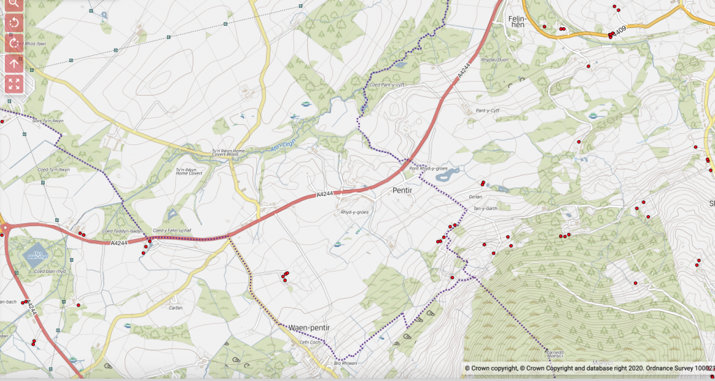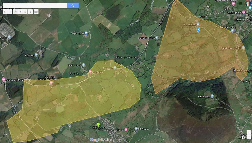 Mae cysylltiad gwael rhwng rhannau o gymunedau Rhiwlas, Waen Pentir a Felin hen a’r ardaloedd cyfagos. Mae’r map isod yn dangos yr eiddo nad ydyn nhw’n rhan o unrhyw gynllun cyflwyno ar hyn o bryd i gael band eang cyflym iawn wedi’i gysylltu yn y 2 – 3 blynedd nesaf. Yn ôl y data mwyaf diweddar sydd ar gael gan Lywodraeth Cymru, ni fydd yr holl eiddo sydd wedi’u marcio â dot coch yn cael band eang cyflym iawn cyn 2023 ar y cynharaf.